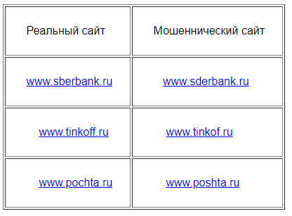 Перед тем как указывать персональную информацию на сайте (например, если «сотрудник банка» попросит вас подтвердить операцию с картой), обязательно проверьте его на достоверность. Для этого достаточно взглянуть на адрес предоставленного ресурса и сопоставить его с адресом реального сайта. Вот несколько примеров, как может выглядеть мошеннический сайт: